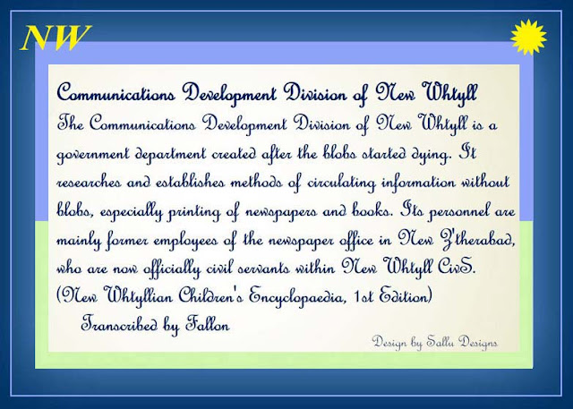 The young woman smiled at her. “Hadda bring her in, her Dad’s work’s really dirty, they’re trialling a new sewage system that doesn’t use blobs, and both our mums have been called up for transcribing duties! You gotta laugh, poor Mum’s writing out stuff about primmo methods of transport on non-humanoid worlds, half the words don’t make sense even in Intergalactic, makes ya wonder just how blobbed-out the Encyclopaedia is, and Mum-in-IG-law, she’s writing out stuff about making energy out of plants, she doesn’t understand a blind word of it!”